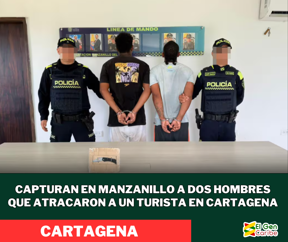 La Policía Metropolitana de Cartagena capturó en el sector de Manzanillo del Mar a dos hombres que minutos antes habían asaltado a un turista utilizando un arma blanca para intimidarlo. Gracias a la rápida denuncia ciudadana a través de la línea 123 y a la oportuna reacción de las patrullas que recorren la zona de playas, los presuntos delincuentes fueron interceptados y aprehendidos.